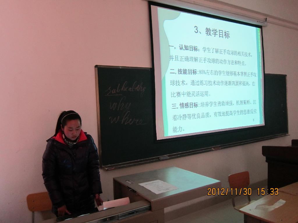 2012年11月30日下午,体育部组织全体教师在教学楼911多媒体教室开展说课比赛活动。