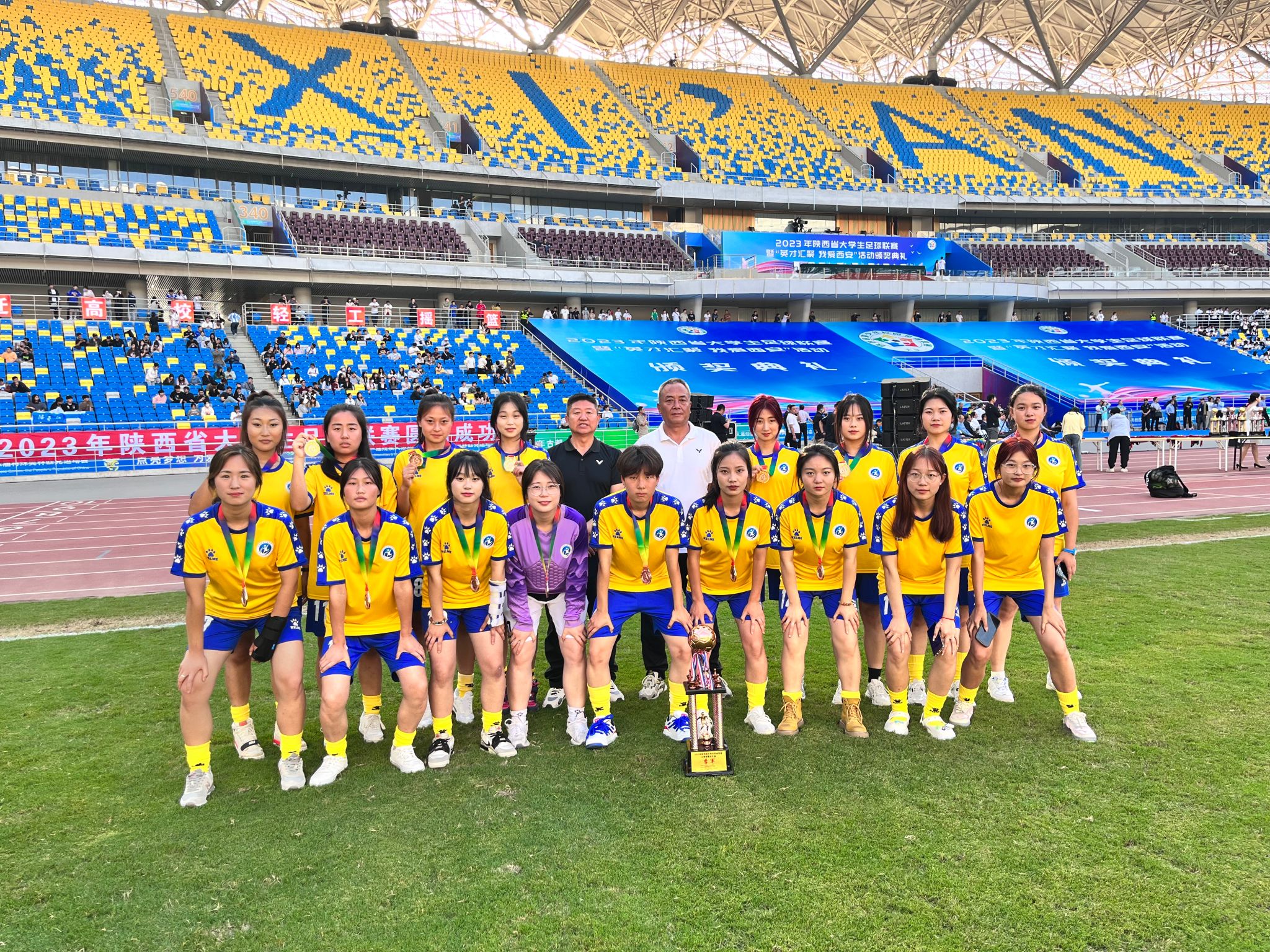 在刚刚结束的2023年陕西省老员工足球联赛中,咸阳职院女子代表队首次参赛并取得了三级联赛第三名的好成绩。