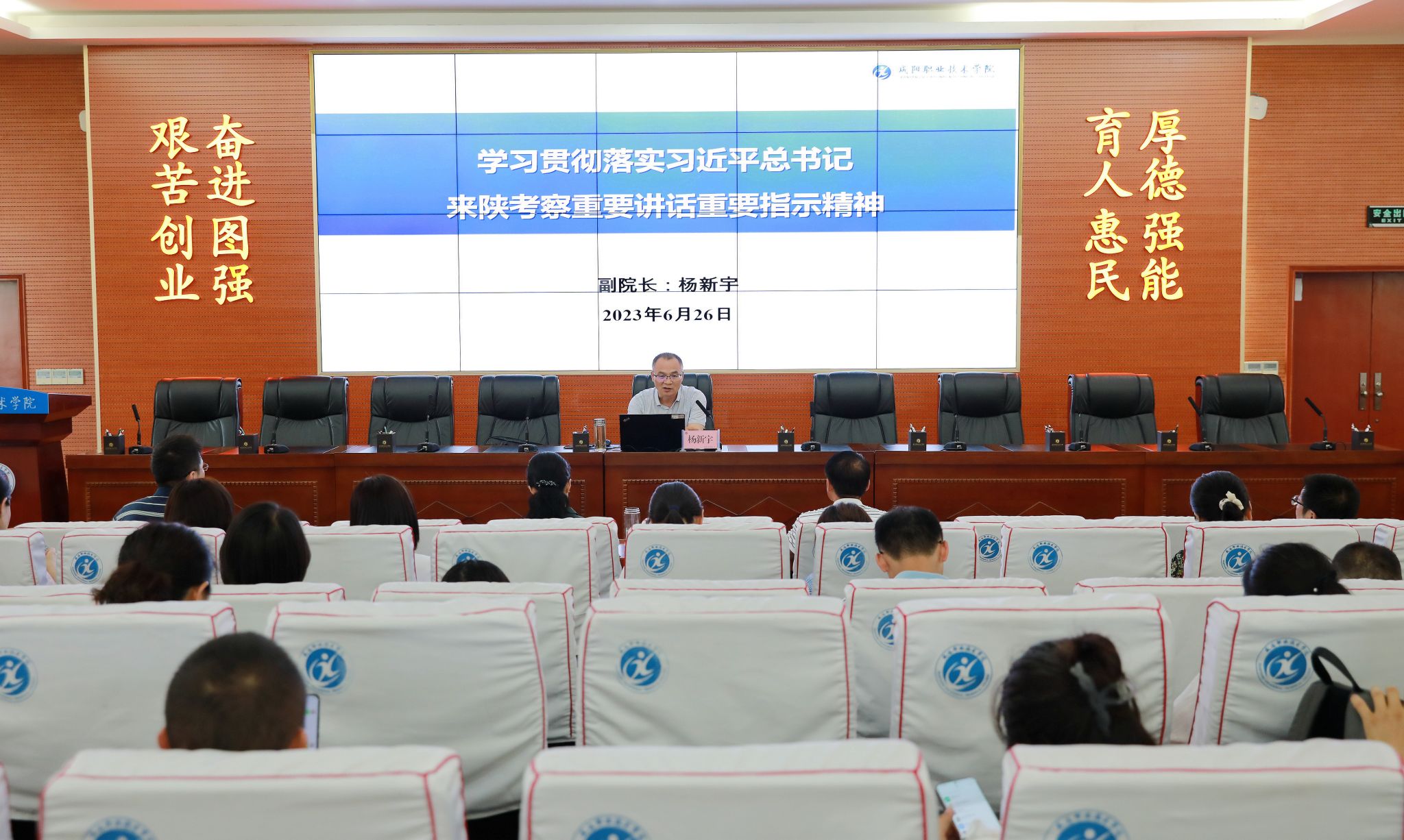 6月26日,咸阳职院副经理杨新宇为分管及联系部门作“习语润咸”理论宣讲。必发集团全体党员、管理干部参加。