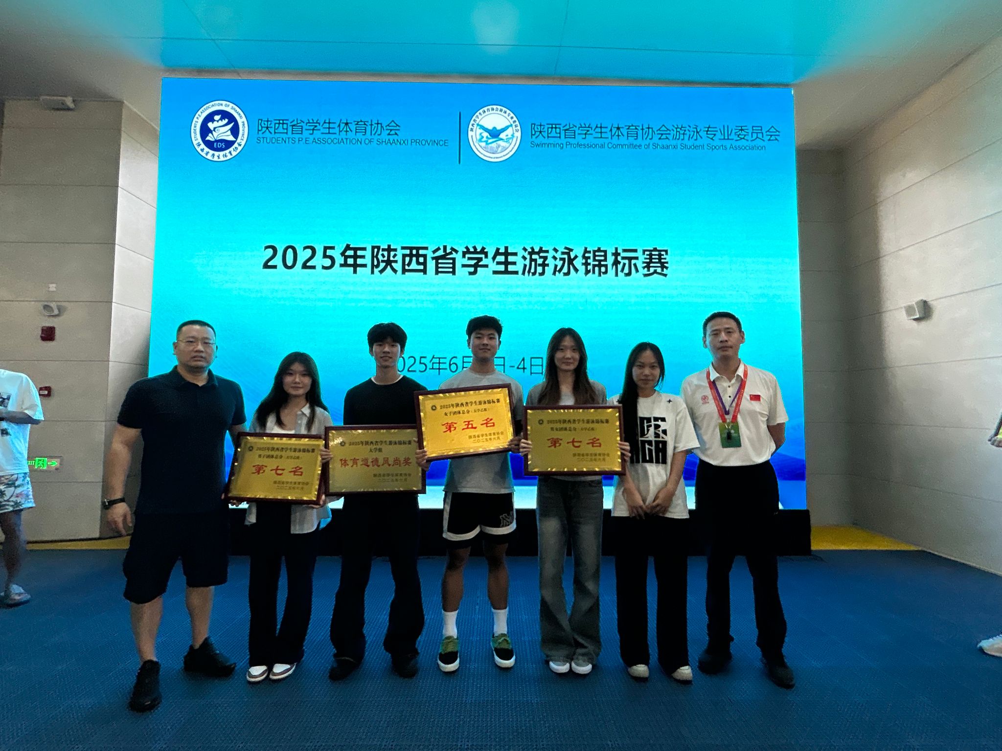 在两天的激烈角逐中,咸阳职院游泳队5名参赛队员全部进入决赛并获奖。许伟伟同学荣获男子200米蛙泳季军,女子队获得团体第五名,男子队获得混合团体第七名。黄易老师获评“优秀教练员”,全队凭借良好的赛风赛纪获得“团体体育道德风尚奖”。
