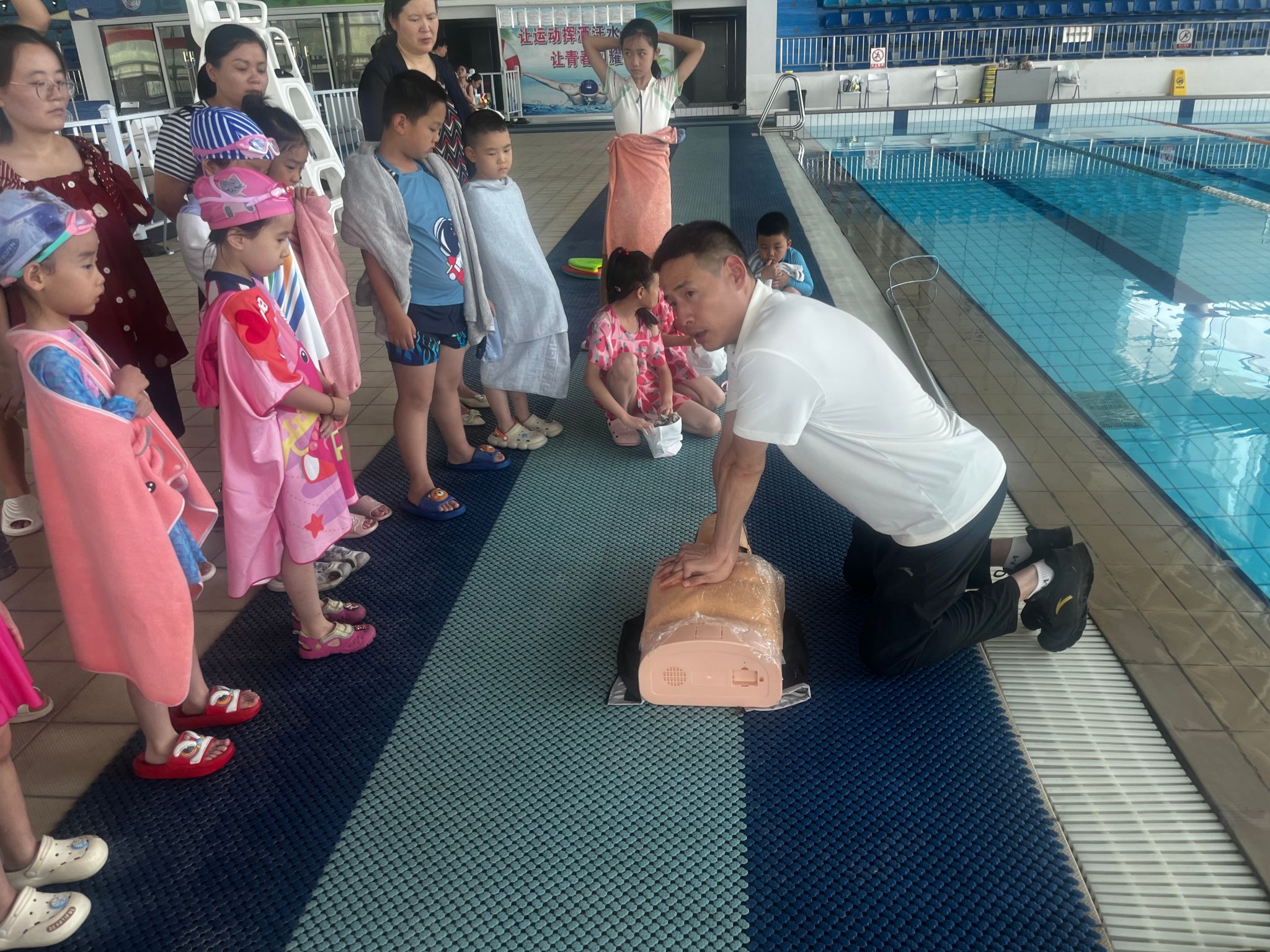 培训内容围绕防溺水安全知识展开,涵盖案例分析、溺水辨别、自救与施救方法以及心肺复苏操作演示等环节。张新老师作为凭借其国家级游泳裁判员、国家级游泳救生裁判员、国家中级游泳救生员、国家中级游泳社会指导员的工作经历,以其丰富经验,深入浅出地讲解了防溺水的重要性和具体措施。他通过生动的案例分析,使员工和家长深刻认识到溺水事故的严重性;借助图片和视频资料,详细讲解了溺水时的常见表现,帮助员工学会及时辨别危险;重点阐述了水中抽筋、呛水等突发情况的自救技巧,以及溺水后的互救技能,并通过现场演示,向师生展示了心肺复苏的规范操作流程。此外,张新老师还结合“六不两会四知”防溺水要求,向员工和家长普及了防溺水的基本准则,强调了家长在孩子暑期安全监管中的重要责任。