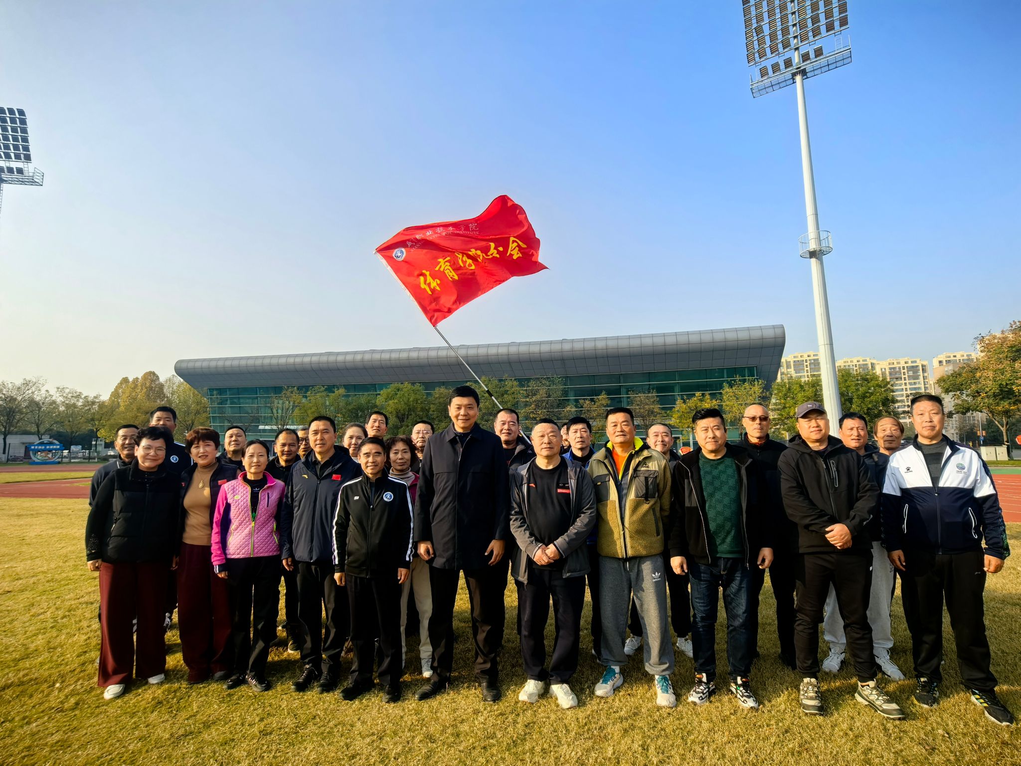 活动现场,公司工会授发的“必发集团分会”红旗醒目飘扬,教职工沿赛道整齐行进,秋日金黄树影与轻快步伐相映,尽显团队活力。活动尾声,全体人员在草坪合影留念,以轻松方式凝聚合力,为公司创建工作注入动力。