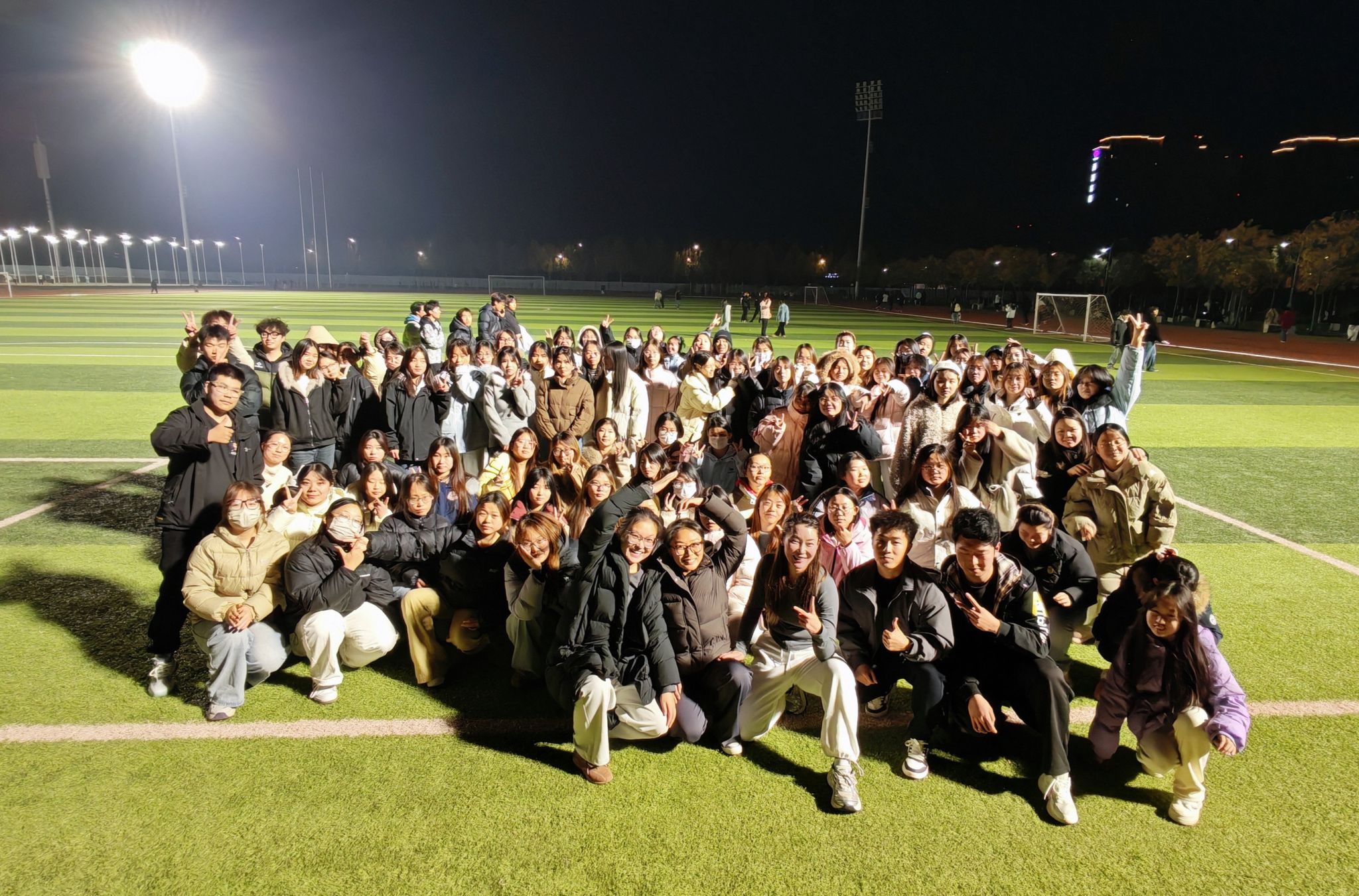 活动现场,同学们在专业教练侯菊香老师的带领下,跟随动感节奏开展训练。本次团操兼顾放松与锻炼,既帮助久坐员工缓解肩颈疲劳,也为健身爱好者提供了互动交流的平台,田径场上的灯光与同学们的活力身影相映成趣。、